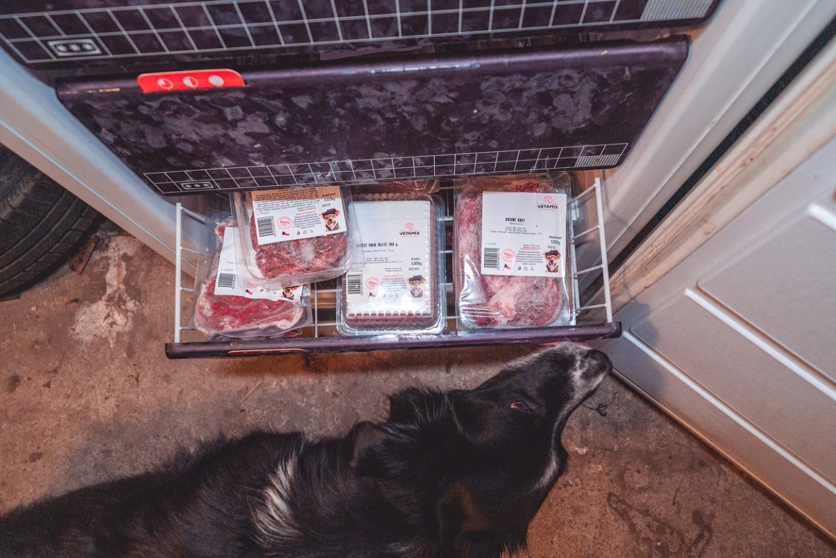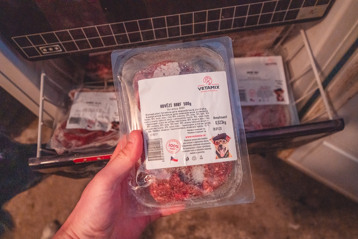 Pár z nich si vezmem ale do mrazničky pod chladničkou v byte a jeden balíček nechám uložený priamo v chladničke, kde pomaly rozmrzne. Akonáhle spotrebujem rozmrazené mäso, už sa mi pomaly rozmrazuje ďalší balíček, aby bol ready, keď spotrebujeme ten prvý. Prakticky nikdy mi BARF v chladničke nestojí dlhšie ako spomínané 2 – 3 dni a vydrží tak čerstvý.