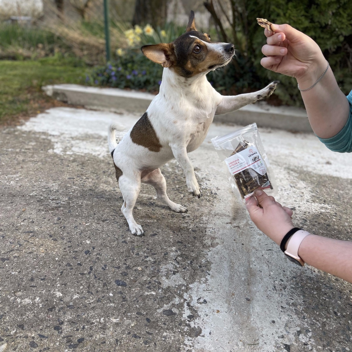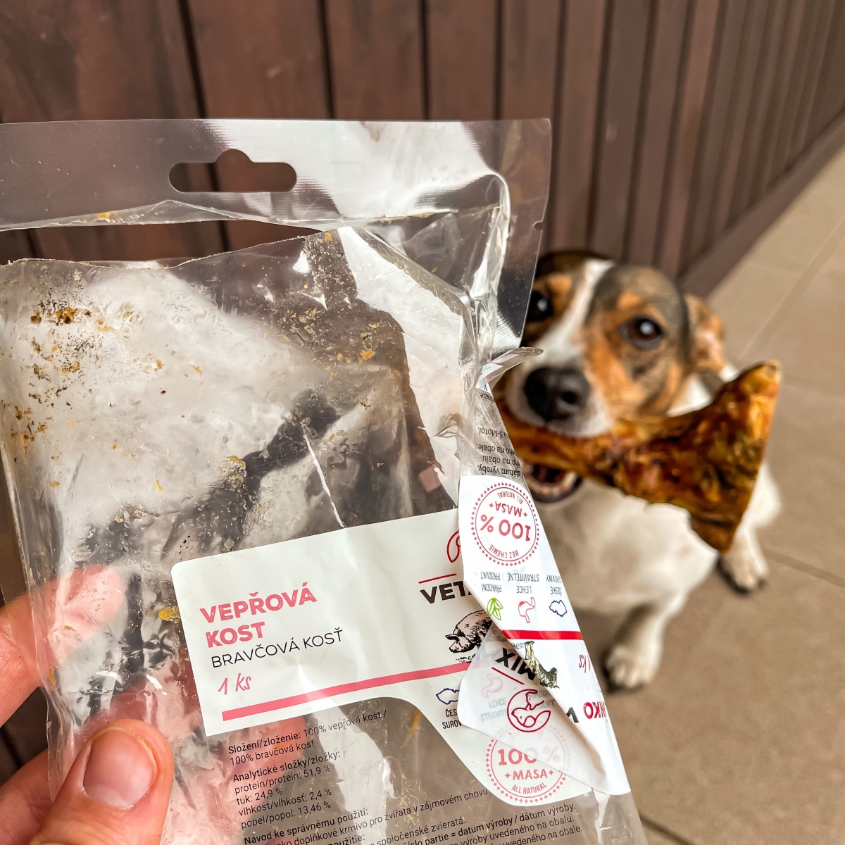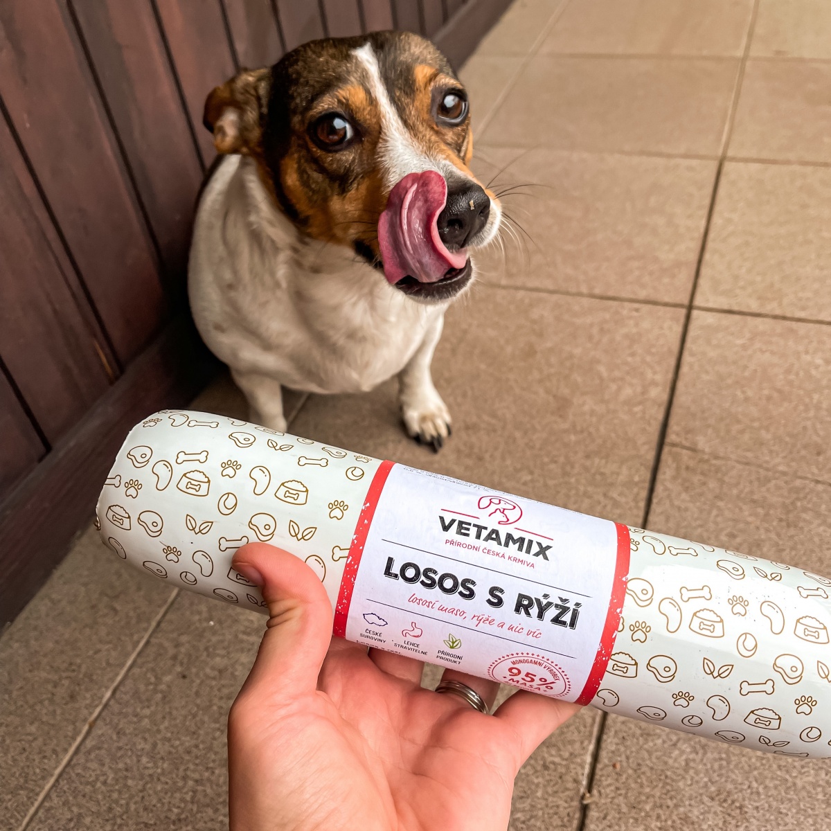 - Potom samozrejme maškrty a konzervy. Ja som veľmi rada, že Vetamix vyrába aj konzervy 400 g. To má Ellie na jeden až dva dni. Beriem samozrejme aj tie väčšie, tie potom máme dlhšie v chladničke, pretože to má na niekoľko dní. Ono to asi nevadí, vydrží to, ale samozrejme lepšie je vždy čerstvé. Veľký pes to má na dvakrát do misky.